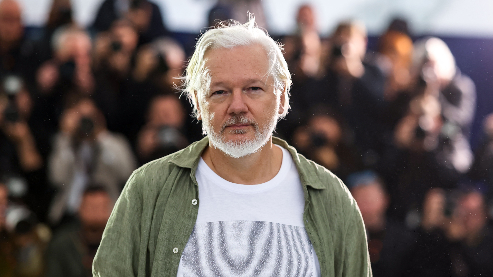 Julian Assange, the founder of Wikileaks, appeared at the Cannes Film Festival wearing a shirt printed with the names of thousands of Palestinian children killed in Israel’s war on Gaza.