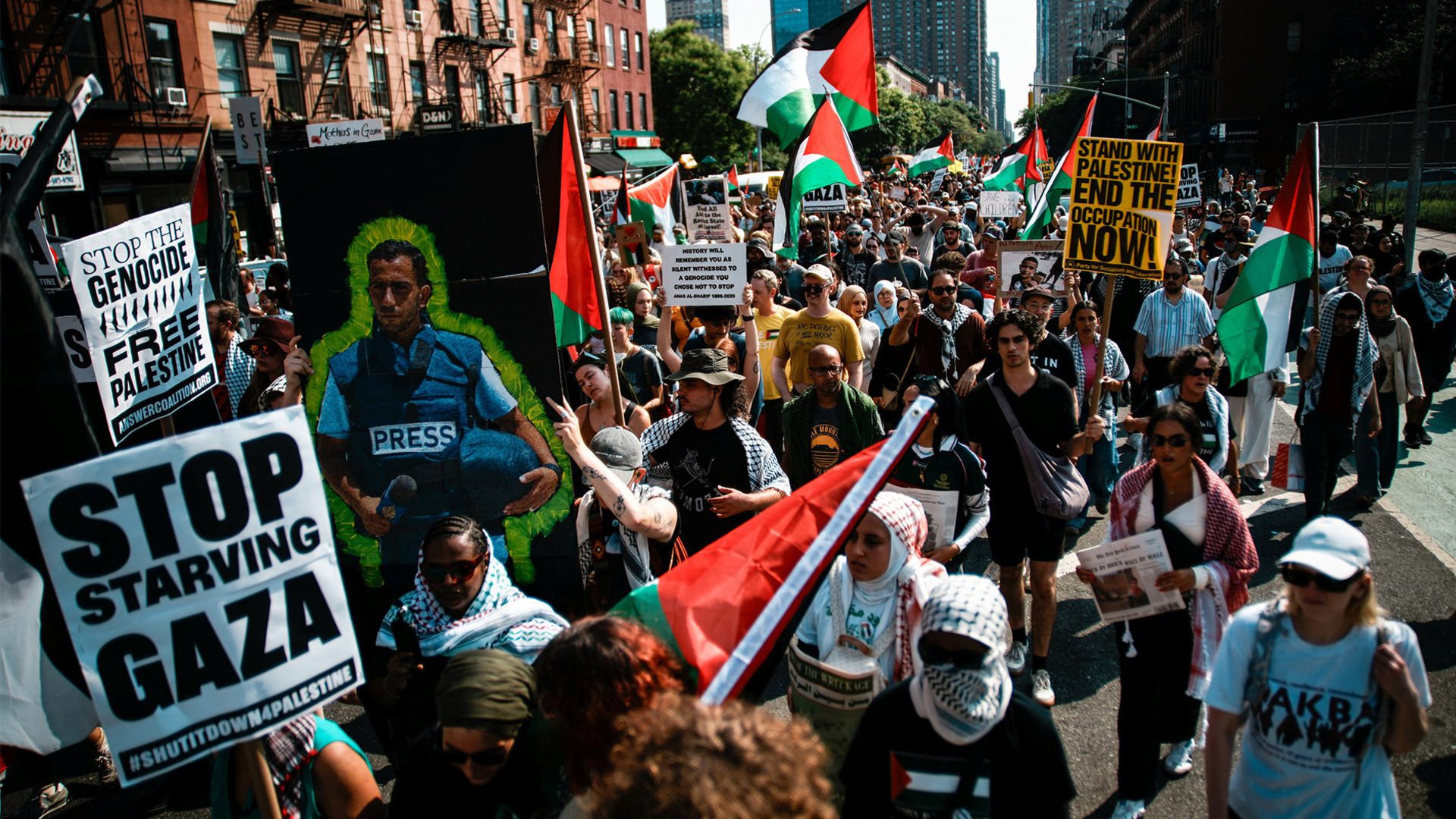 Thousands rallied in New York for a ‘Mass March for Humanity’ demanding an end to Israel’s imposed starvation of Gaza and the complicity of the US. Protesters honoured slain journalists, including Al Jazeera’s Anas al-Sharif, and accused Israel of targeting media workers.